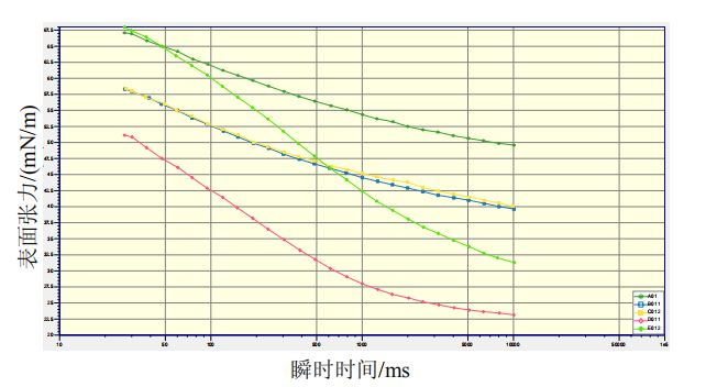 通過檢測不同制劑配方的藥液動態表面張力,以達到藥液有效快速附著、潤濕葉片的目的,來提升藥效。通過分析30 ms到1000 ms內,稀釋藥液在表面吸附期的動態表面張力迅速變化,來初步判斷藥液與雜草葉面的接觸和潤濕情況。最終結合室內藥效數據,來研究藥液動態表面張力與藥效關系。