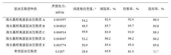 mN/m,潤(rùn)濕角改變值≥40°,減阻率≥70%,防膨率≥90%,阻垢率≥80%。從表2中數(shù)據(jù)可以看出,新研究的海水基耐高溫驅(qū)油壓裂液,在實(shí)驗(yàn)溫度180℃條件下,各項(xiàng)指標(biāo)均達(dá)到海上油田的要求;在相同條件下,其界面張力值、潤(rùn)濕角改變值、減阻率、防膨率、阻垢率均優(yōu)于常規(guī)驅(qū)油壓裂液產(chǎn)品。