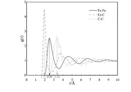 Fe-C二元體系經(jīng)計(jì)算得到的徑向分布函數(shù),F(xiàn)e-Fe、Fe-C、C-C原子對(duì)的平均鍵長分別為若原子間距離小于相應(yīng)的鍵長值則表示兩個(gè)原子之間互相連接,根據(jù)碳原子連接的鐵原子個(gè)數(shù),可將鐵原子區(qū)分為自由態(tài)鐵原子(與碳原子沒有配位關(guān)系)、A型鐵(只與1個(gè)碳原子形成配位關(guān)系)、B型鐵(與2個(gè)或更多的碳原子形成配位關(guān)系)三種類別,根據(jù)模擬結(jié)果數(shù)據(jù)可對(duì)鐵原子的配位方式進(jìn)行分析。