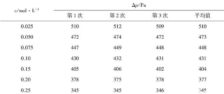 ⑥按照上述方法測定不同濃度正丁醇溶液的Δpmax值。不同溶液測定時須按低濃度到高濃度的次序測定;測定每一樣品時只需要用同樣濃度的溶液淌洗3次即可,并對測量數(shù)據(jù)進(jìn)行記錄(例見表1)。
