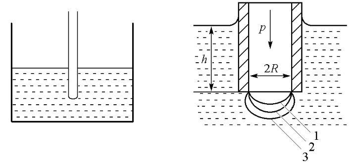 由于最大氣泡壓力法的器材易得,且易于學(xué)生理解表面張力的原理,因而一直是教學(xué)中測定液體表面張力的一種常用方法[2]。如圖1所示,測定時將一根毛細(xì)管插入待測液體內(nèi)部,從管中緩慢地通入惰性氣體對其內(nèi)的液體施以壓力,使管端形成氣泡逸出。當(dāng)所用的毛細(xì)管管徑較小時,可以假定所產(chǎn)生的氣泡是球面的一部分;但是在氣泡生成及發(fā)展過程中,氣泡的曲率半徑會隨惰性氣體的壓力變化而改變。當(dāng)氣泡的形狀恰為半球形時,氣泡的曲率半徑最小(即毛細(xì)管半徑R),此時根據(jù)Laplace方程,管內(nèi)外壓差達(dá)最大,其值Δpmax=p-ρgh可由差壓計(jì)測量得到[3]。利用最大壓差和毛細(xì)管半徑即可計(jì)算表面張力σ: