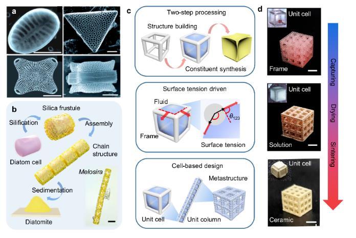 硅藻獨特的生物礦化過程使硅藻擁有多種多樣的硅酸鹽外殼形貌(圖1a)。不同于陶瓷3D打印的逐層增材制造,硅藻殼的生物礦化由結構成型和成分匹配兩部分組成,硅藻細胞構成了最開始的有機骨架,而持續的硅化過程則進一步合成了硅酸鹽外殼的主要成分。這種將結構成型和成分匹配分開的兩步法策略可以有效提高合成速度。