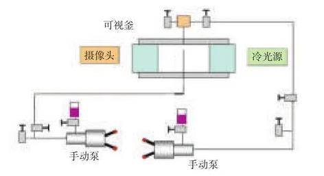 潤濕性及界面張力儀主要包括常溫常壓型、高溫型、超高溫型、便攜型,其中高溫高壓型潤濕性及界面張力儀能夠真實模擬油藏條件測量接觸角和界面張力。為了擴展高溫高壓潤濕性及界面張力儀可以測量二氧化碳與原油最小混相壓力功能,且可以使常溫凝固的稠油等樣品,實現(xiàn)順利進樣測量和測量,需要對現(xiàn)有設備進行改造。通過增加高溫高壓氣體進樣系統(tǒng),改進原有油相、水相進樣系統(tǒng),使其功能得到擴展。