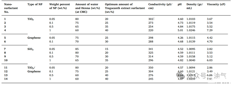 本研究研究了石墨烯、二氧化鈦(TiO2)和二氧化硅(SiO2)納米顆粒、TiO2和石墨烯的復(fù)合納米粒子以及指甲花提取物表面活性劑的納米復(fù)合物對(duì)降低油水界面張力的影響。研究人員使用溶膠-凝膠技術(shù)合成上述納米顆粒,并采用天然水性懸浮表面活性劑(黃芪膠提取物)對(duì)納米表面活性劑的穩(wěn)定性進(jìn)行了研究。通過電導(dǎo)率、濁度和界面張力實(shí)驗(yàn)測(cè)定了指甲花提取物表面活性劑的CMC值。為了穩(wěn)定重量百分比不同且納米顆粒類型也不同的納米表面活性劑,使用粒徑和zeta電位測(cè)量來確定黃芪膠表面活性劑各自的最佳濃度。最后,通過界面張力測(cè)量,使用穩(wěn)定的納米表面活性劑來研究其對(duì)IFT的影響。