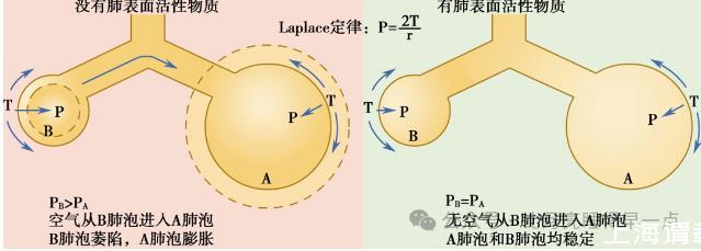 由上述公式可知,在T相同的情況下,肺泡半徑r越大,則肺泡液氣界面的壓強越小;肺泡半徑r越小,則肺泡內液-氣界面的壓強越大。