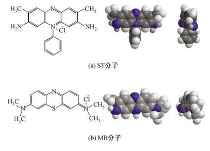 為了更清晰地了解界面組裝中使用的亞相溶液特征,把所選的ST和MB染料分子進行了二維和三維空間填充模型正面、側面的表示,如圖2所示,可以更直觀地觀察到兩種分子結構上的差異。它們的相似之處在于,都含有較大的雜環共軛體系,可以在LDH-HS復合LB膜中形成H-和/或J-型的聚集體[20]。這也就對應于前面提到的LDH-HS/染料復合膜在透射電鏡和原子力顯微鏡下觀測到的不同形態的聚集體。也正是由于LDH-HS分子片層為染料分子提供了合適的生長平臺,在LB技術的幫助下在氣-液界面之間形成了高質量的、均勻致密的LDH-HS/染料分子聚集體。
