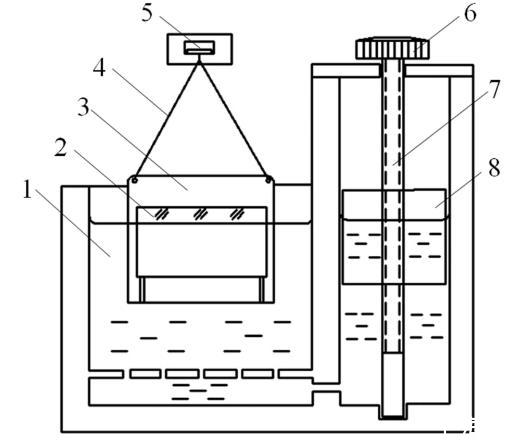 新型表面張力測試儀基本結構如圖2所示,該儀器盛有液體(1),儀器采用連通器結構,截面積較大的左端放置拉力框(3),截面積較小的右端設有升降塊(8),旋動栓鈕(6)和螺桿(7),可使升降塊(8)上升或下降,從而引起液面相應的但速度更緩慢的升降。為減小液面升降時的波動,容器的兩端通過若干均勻分布的小孔相連通。為便于觀測液面位置,容器壁采用透明的有機玻璃材料,通過讀數顯微鏡確定液面高度。