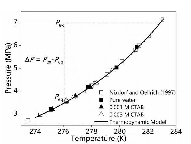 圖1.甲烷水合物在純水與表面活性劑溶液中的相平衡條件