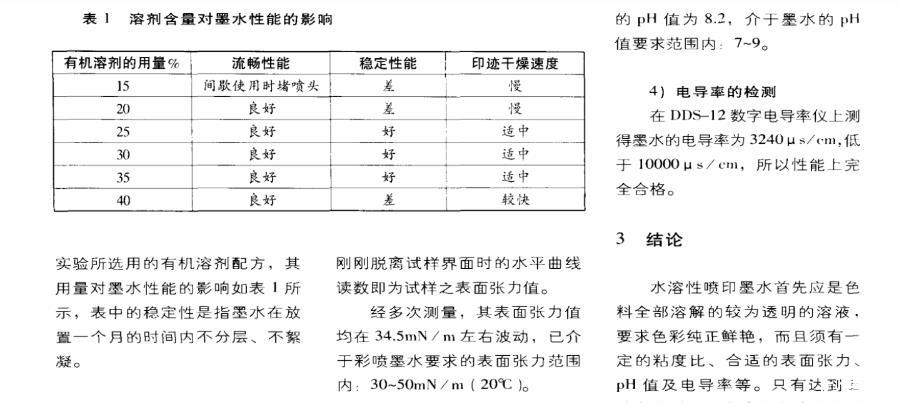 噴墨墨水中有機溶劑的成分及所占的比例對墨水的性能影響非常大。一般情況下,溶劑的用量是墨水重量的10%-50%。當溶劑含量低于10%時,作用不明顯,超過50%時有些染料則無法溶解。