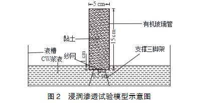 浸潤滲透試驗模型如圖2所示,主要由液槽、支撐三腳架和透明有機玻璃管組成。有機玻璃管直徑5cm,高15cm,頂端敞開,底部封閉鉆有直徑0.5cm的進漿孔。試驗時將黏土裝入有機玻璃管中,振搗壓實,底部開孔處墊有紗網,防止土體掉落。將有機玻璃管和支撐三腳架放入漿液槽內,有機玻璃管底部浸入漿液液面以下1.0cm,使漿液從底部滲入黏土中,通過觀察漿液在不同時間的滲透高度來評價漿液的浸潤滲透效果。
