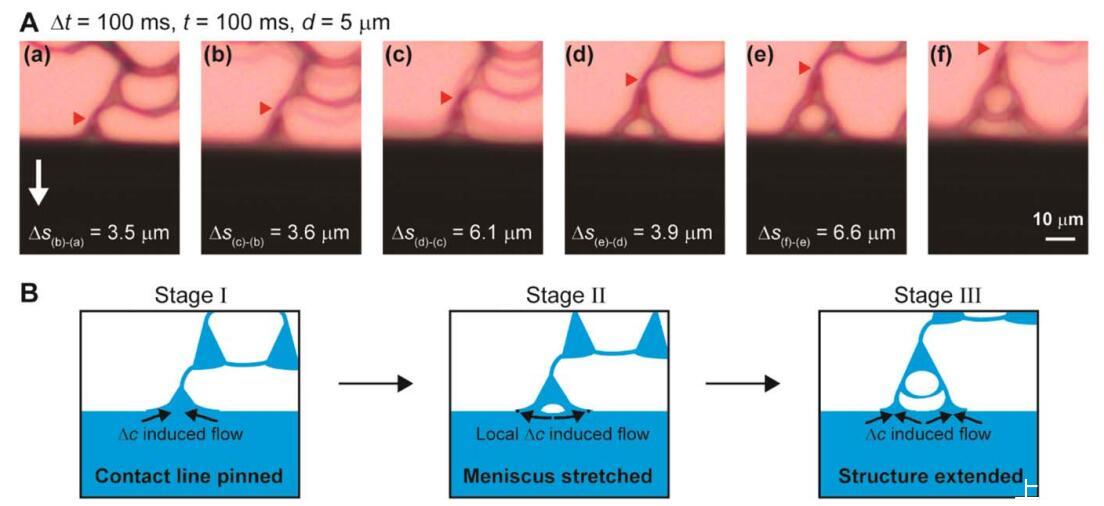 揭示自發結構形成的細節 超支化結構,我們采用原位顯微鏡[圖。 3(A)]。 視頻圖像顯示超分支 結構通常分三個階段形成[圖。 3(B)]。 我們注意到,由于我們的彎液面的動態 過程中,我們很難測量波長 動態彎液面。 在第一階段,手指平行于 由于馬蘭戈尼不穩定性而出現流動方向 和摩擦。 重要的是,三角形半月板將手指連接到半月板前部。 由于手指是 與本體溶液相比,PS 的濃度更高, 手指的表面張力相對較高,拉入 本體溶液,具有較低的表面張力。 這一步是 如圖3(B)(a)所示。