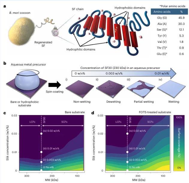 圖1作為天然表面活性劑的SF。b,旋轉(zhuǎn)涂層金屬水合物提高表面覆蓋率的示意圖。金屬水合物溶液的表面覆蓋率的示意圖。c,d,添加了SF的金屬水溶液的表面覆蓋率(%)。的表面覆蓋率(%)?;祝╟)和基底上的表面覆蓋率(%)。基底(d)上SF添加的金屬水溶液的表面覆蓋率(%)與濃度和分子量的函數(shù)關(guān)系。