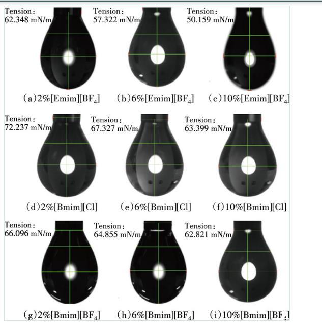 1)表面張力測試。在室溫為25℃的環(huán)境中,利用電子天平將[Emim][BF4]、[Bmim][Cl]、[Bmim][BF4]分別配制質(zhì)量分數(shù)為0.6%、0.7%、0.8%、0.9%、1%、2%、3%、4%、5%、6%、7%、8%、9%、10%的活性水溶液,測定不同質(zhì)量分數(shù)下離子液體溶液的表面張力3次,取平均值。