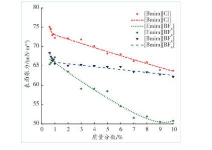 圖2表面張力與離子液體質(zhì)量分數(shù)之間的關系