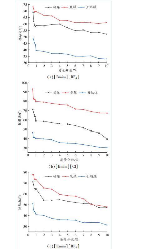對于光滑的煤樣,離子液體對煤樣的潤濕程度采用接觸角作為評價指標。3種煤樣的接觸角與不同離子液體質(zhì)量分數(shù)之間的關系如圖3所示。