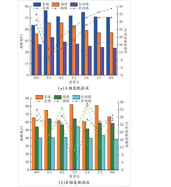 1)與純水相比,復(fù)配后的A、B 2組溶液的接觸角明顯降低,對于焦煤、褐煤、長焰煤,B組溶液復(fù)配質(zhì)量比為2∶4時接觸角降低最多,分別為31.131%,27.969%、14.713%;對于焦煤,A組溶液復(fù)配質(zhì)量比為6∶0時接觸角降低最多,為26.452%,對于褐煤、長焰煤,A組溶液復(fù)配質(zhì)量比為1∶5時接觸角降低最多,為25.982%、20.026%。
