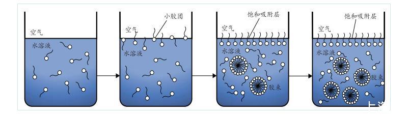 由圖2可知,隨著溶液中EMI質(zhì)量分?jǐn)?shù)的增大,表面張力持續(xù)降低。當(dāng)溶液中EMI質(zhì)量分?jǐn)?shù)大于0.6%后,表面張力的變化趨勢(shì)逐漸變緩,幾乎維持在同一水平。出現(xiàn)這種現(xiàn)象的主要原因在于加入溶液中的EMI會(huì)對(duì)溶液的表面張力產(chǎn)生重要影響。EMI分子本身具有兩親性質(zhì),其中有機(jī)高分子會(huì)在溶液的表面形成吸附,并在液面定向排列,使疏水基擴(kuò)展于空氣中,親水基則與水面吸附,溶液中EMI分子吸附狀態(tài)隨其質(zhì)量分?jǐn)?shù)變化情況如圖3所示。吸附于水面的EMI分子達(dá)到飽和狀態(tài)時(shí),EMI溶液的膠束質(zhì)量分?jǐn)?shù)便達(dá)到臨界值,EMI分子開(kāi)始締合逐步形成膠束聚集物,該質(zhì)量分?jǐn)?shù)即為溶液的CMC值。之后,繼續(xù)加入EMI溶液,表面張力不再發(fā)生較大波動(dòng),溶液內(nèi)逐漸締合成更多穩(wěn)定的膠束。
