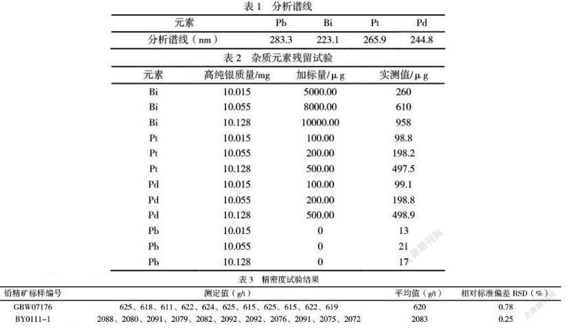 本方法中銀的含量是通過經(jīng)典重量法減去雜質(zhì)元素(鉛、鉍、鉑、鈀)和金所得,避免了高倍數(shù)的稀釋體積及苛刻環(huán)境要求帶來的誤差,分析結(jié)果準(zhǔn)確穩(wěn)定、精密度高,適用于鉛精礦中銀含量的測(cè)定,滿足行業(yè)分析需求。