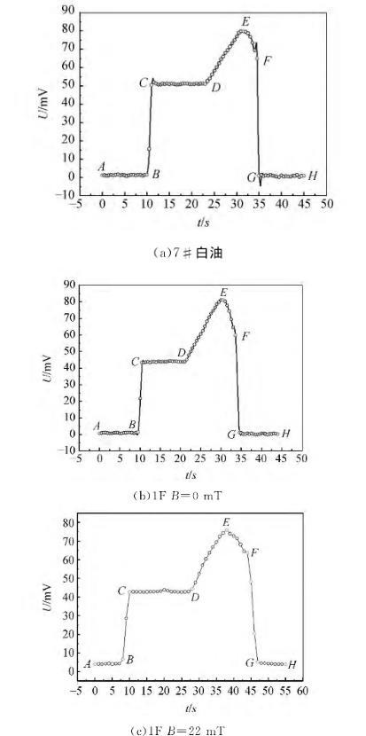 使用拉脫法測量了磁性液體的磁表面張力,無外加磁場作用時,磁性液體的表面張力小于其載液的表面張力,磁性液體液膜拉得更長,液膜收縮的趨勢比白油更明顯,這主要是因為磁性液體中加入的表面活性劑降低了其表面張力。由液膜拉脫過程電壓變化曲線可觀察到:不同條件下磁性液體的電壓變化情況不同,無外加磁場作用時2F號磁性液體在EF階段存在轉折點Q,越過轉折點,QF階段電壓變化較平緩,且表面張力越小;而7#白油和1F磁性液體并未出現此現象,這主要是因為7#白油和1F磁性液體表面張力較大,2F號磁性液體由于表面張力較小,其液體分子與分子之間的作用力較弱,宏觀表現為拉脫的液膜更長,液膜在空氣中會存在一段時間。有外加磁場作用時,2F號磁性液體在FG階段并未出現電壓變化平緩的中間過程,但FG階段出現了另一些數據點,液膜破裂的時間大于無外加磁場作用時的時間,主要是由于外加磁場增強了磁性顆粒之間的相互作用,分子和分子之間的磁吸引力增強,導致液膜逐步破裂。