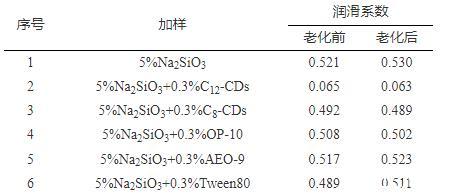 由表2可知,C12-CDs具有優異的潤滑效果,可顯著改善硅酸鹽水溶液的潤滑性能,將潤滑系數從0.521降低至0.065,潤滑系數降低率高達87.52%,經高溫老化后其潤滑系數進一步降低,表明C12-CDs能夠耐高溫耐強堿,與硅酸鹽配伍性良好,而碳鏈相對較短的C8-CDs對硅酸鹽水溶液并沒有表現出明顯的潤滑效果。