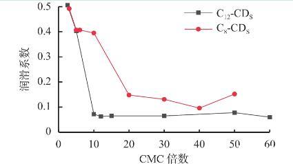 C12-CDS和C8-CDs的潤滑效果存在明顯差異,兩者疏水烷基鏈長度不同,而烷基鏈長度可影響表面活性劑的表界面活性以及膠束的形成,推測是CDs形成的膠束在潤滑過程中發揮作用,由此進一步探究CDs的膠束對潤滑性能的影響,圖2是CDs的硅酸鈉溶液潤滑系數與2種CDS各自的CMC倍數的關系曲線。