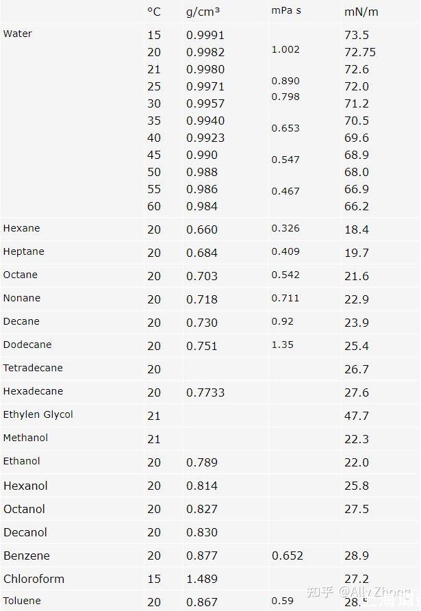 只有少數(shù)樣品可用于此類試驗測量。下表提供了一些此類液體的重要數(shù)據(jù)。這些數(shù)值由不同的作者和方法確定,可以作為標準。