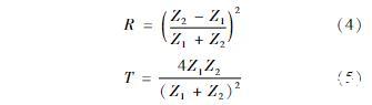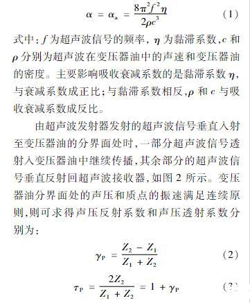 由超聲波發(fā)射器發(fā)射的超聲波信號垂直入射至變壓器油的分界面處時,一部分超聲波信號透射入變壓器油中繼續(xù)傳播,其余部分的超聲波信號垂直反射回超聲波接收器,如圖2所示。變壓器油分界面處的聲壓和質(zhì)點的振速滿足連續(xù)原則,則可求得聲壓反射系數(shù)和聲壓透射系數(shù)分別為: