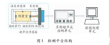 超聲波發(fā)射器、溫度傳感器、測量室和超聲波發(fā)射器組成,其中位于測量室兩端的2個超聲波接收器用于接收在變壓器油中傳播的超聲波信號,超聲波發(fā)射器進行信號發(fā)射。為保證超聲波實驗檢測的精度,變壓器油的多頻超聲檢測是在27.5℃的水浴恒溫環(huán)境中進行的,由位于測量室的溫度傳感器進行監(jiān)測。數(shù)據(jù)處理單元通過數(shù)字信號處理電路與多頻超聲控制單元進行連接,用于處理多頻超聲波接收模塊接收到的超聲波信號。經(jīng)過數(shù)據(jù)處理單元處理的超聲波信號,主要包括不同接收器所接收到的超聲波信號的幅值、相位以及超聲波信號在油中傳播時的聲速和飛行時間。