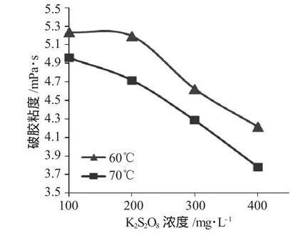 實驗結果表明,溫度為60℃時,隨著K2S2O8破膠劑濃度增加,破膠時間縮短,破膠液粘度和表面張力逐漸降低,當K2S2O8加入量為100mg·L-1時,6h后破膠液粘度為5.236mPa·s,表面張力為9.72mN·m-1。當K2S2O8加入量為400mg·L-1h破膠液粘度為3.784mPa·s,表面張力為9.32mN·m-1。地層中的多孔介質可以形象的比作是相互連通的毛細血管網絡,降低其壓力作用,破膠液必須具有較低的表面張力,才有助于壓裂液的返排。破膠液的表面張力一般要求低于28m N·m-1。