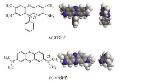 為了更清晰地了解界面組裝中使用的亞相溶液特征,把所選的ST和MB染料分子進行了二維和三維空間填充模型正面、側面的表示,如圖6所示,可以更直觀地觀察到兩種分子結構上的差異。它們的相似之處在于,都含有較大的雜環共軛體系,可以在LDH-HS復合LB膜中形成H-和/或J-型的聚集體。這也就對應于前面提到的LDH-HS/染料復合膜在透射電鏡和原子力顯微鏡下觀測到的不同形態的聚集體。也正是由于LDH-HS分子片層為染料分子提供了合適的生長平臺,在LB技術的幫助下在氣-液界面之間形成了高質量的、均勻致密的LDH-HS/染料分子聚集體。