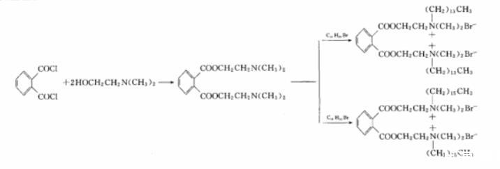 鄰苯二甲酰氯與過量的N,N-二甲基乙醇胺反應(yīng)生成二(二甲基胺基乙基)鄰苯二甲酸酯(Ⅰ),二鄰苯二甲酸酯(Ⅰ)再分別與正溴代十四烷和正溴代十六烷反應(yīng),得到雙季銨基鄰苯二甲酸酯Gemini表面活性劑。反應(yīng)式見圖1。