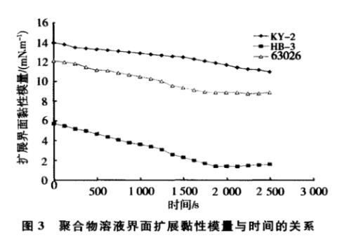 圖2、圖3分別是用蒸餾水配制濃度為1 500 mg/L的3種聚合物溶液測(cè)量的擴(kuò)展彈性模量、擴(kuò)展界面黏性模量。界面活性較高的聚合物(HB-3)的界面彈性模量在20~27 mN/m之間變化,其它兩種聚合物的界面擴(kuò)展彈性模量為60~70 mN/m。其相應(yīng)的界面黏性模量比界面彈性模量低,說明三種聚合物溶液的界面擴(kuò)展彈性占主導(dǎo)。綜上所述,聚合物(KY-2)界面擴(kuò)展黏彈性最好,說明界面層中聚合物分子之間以及聚合物與油分子之間作用比另外兩種聚合物界面層的分子間作用大。