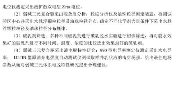 本文主要利用了OMEC PIP9.0型顆粒圖像分析儀檢測(cè)弱堿三元驅(qū)乳狀液乳化程度;動(dòng)態(tài)界面張力儀檢測(cè)弱堿三元采出液油水界面動(dòng)態(tài)界面張力;DHR-2界面流變儀測(cè)定弱堿三元復(fù)合驅(qū)采出液界面強(qiáng)度;ZetaPALS電位儀檢測(cè)弱堿三元驅(qū)采出液擴(kuò)散雙電層電位;BT-9300H型激光粒度分布儀測(cè)定弱堿三元復(fù)合驅(qū)采出污水中懸浮固體粒徑以及油珠粒徑分布;多種不同破乳劑進(jìn)行破乳脫水實(shí)驗(yàn)進(jìn)行初步篩選,再對(duì)脫水效果好的破乳劑進(jìn)行不同時(shí)間、溫度、濃度的比較選出效果最好的破乳劑;990型電導(dǎo)率測(cè)定儀測(cè)定采出水電導(dǎo)率;IJJ-IIB型原油介電強(qiáng)度自動(dòng)測(cè)試儀測(cè)試取樣井在不同時(shí)期,不同化學(xué)劑含量下的擊穿場(chǎng)強(qiáng)。