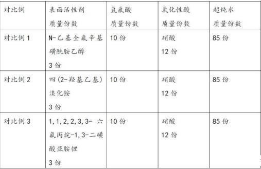基于表3可以看出,對(duì)比例1和實(shí)施例1的區(qū)別僅在于兩親性離子液體不同,其中,對(duì)比例1采用常規(guī)的N-乙基全氟辛基磺酰胺乙醇作為表面活性劑,導(dǎo)致表面張力增加,蝕刻選擇比降低。對(duì)比例2未加入1,1,2,2,3,3-六氟丙烷-1,3-二磺酸亞胺鋰,無(wú)法調(diào)節(jié)蝕刻速率。對(duì)比例3單獨(dú)采用1,1,2,2,3,3-六氟丙烷-1,3-二磺酸亞胺鋰作為表面活性劑,導(dǎo)致表面張力增加,蝕刻選擇比降低,而本發(fā)明合成的離子液體同時(shí)具有多氟基團(tuán)、環(huán)狀結(jié)構(gòu)、多羥基,能夠顯著降低表面張力,同時(shí)提高蝕刻選擇比。