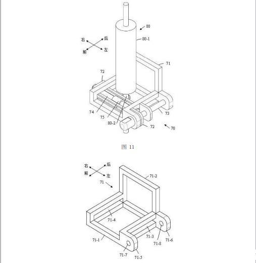 如圖10和圖11所示,注射器調(diào)節(jié)組件70包括固定座71、滑動座72、第二絲桿73、第三絲桿74、以及第二螺母件75。