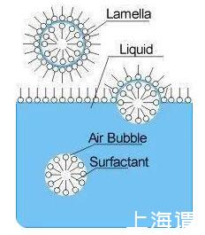 說了這么多,表面張力和泡泡到底有什么關系呢?純水的表面張力比較大,不能形成穩(wěn)定的泡泡,因為泡泡的產生會增大氣液間的表面積,使得表面自由能增大,這是熱力學不穩(wěn)定的。加入表面活性劑后,表面活性劑的親水基團插入水相,疏水基團豎在空氣中,這樣降低了表面張力,讓泡泡能穩(wěn)定存在一段時間。從下面這張圖中可以看出,泡泡膜是三明治結構,兩側是表面活性劑,中間夾著一層水,這一三明治結構對后面泡泡水的配方至關重要。