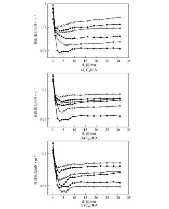 圖4 C8 DEA、C10 DEA、C16 DEA對C12 DEA/C14 DEA復配體系油/水動態(tài)界面張力的影響