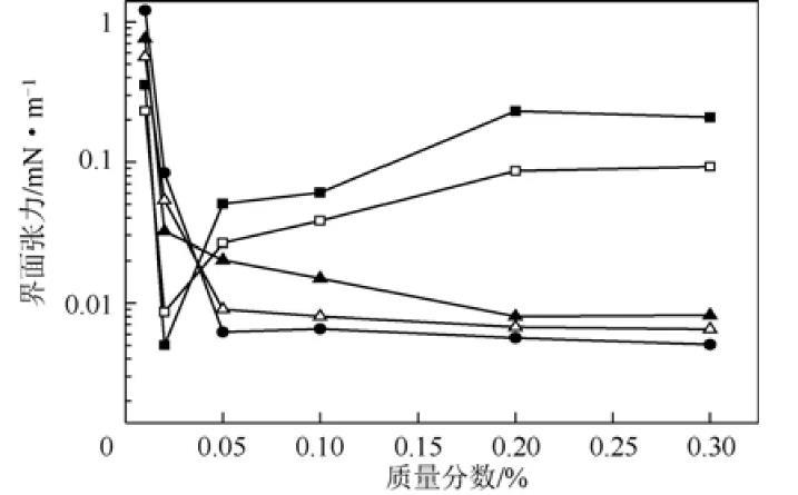 圖2不同烷醇酰胺油/水界面張力穩(wěn)定值隨質量分數的變化曲線