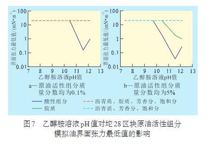 從乙醇胺溶液的pH值對不同質(zhì)量分數(shù)坨28區(qū)塊原油活性組分模擬油界面張力最低值的影響(圖7)可看出,當活性組分質(zhì)量分數(shù)為0.1%時,只有酸性組分與有機堿發(fā)生作用;當質(zhì)量分數(shù)增大至5%時,膠質(zhì)組分開始作用,而瀝青質(zhì)界面張力依舊較高。這可能是由于坨28區(qū)塊原油瀝青質(zhì)中酸性組分含量過少造成的。因此,對于坨28區(qū)塊原油,與乙醇胺作用的難易順序為:酸性組分最強,膠質(zhì)次之,瀝青質(zhì)、飽和分和芳香分與之作用比較微弱。