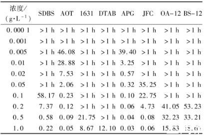 2)表面活性劑溶液的表面張力與其自身性質(zhì)及濃度密切相關(guān)。8種表面活性劑溶液表面張力隨濃度的增大先減小后在臨界膠束濃度附近穩(wěn)定,其表面張力均遠(yuǎn)小于水的表面張力。因8種表面活性劑的性質(zhì)不同,臨界膠束濃度值和表面張力值分別在0.04~053 g/L和25.61~34.79 mN/m之間差異較大。8種表面活性劑按降低溶液表面張力的能力由強(qiáng)到弱排序為:APG>AOT>JFC>SDBS>OA-12>BS-12>1631>CTAB,非離子>陰離子>兩性型>陽離子。非離子表面活性劑APG形成膠束和降低表面張力能力均為最佳,其臨界膠束濃度為0.04 g/L,表面張力為25.61 mN/m。