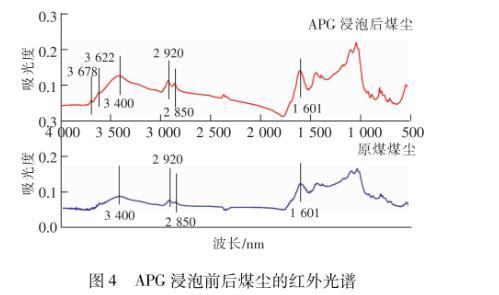 由上述實驗結(jié)果可以看到,在8種表面活性劑中,非離子表面活性劑APG形成膠束和降低表面張力的能力最強(qiáng),潤濕煤塵效果最好。通過測定APG浸泡前后煤塵表面官能團(tuán)及粒徑分布特征的變化,分析其潤濕煤塵的作用機(jī)理。