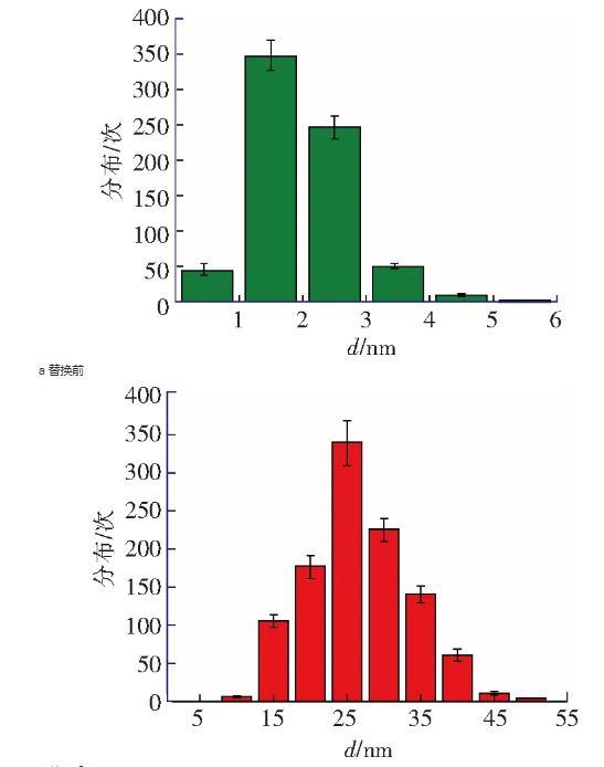 納米氣泡的高度在8~20 nm范圍之內(nèi),直徑在100~500 nm范圍之內(nèi),圖3c為圖3b中典型納米氣泡的截面圖。掃描得到納米氣泡圖像以后,在該表面上進(jìn)行力曲線測量實驗,如圖2b所示。所有離曲線的‘跳進(jìn)’距離均大于10 nm且是變化的,同時,由雙電層引起的斥力也消失了,不符合DLVO理論。這種‘跳進(jìn)’距離不同的長程力應(yīng)該是因為醇-水替換后HOPG表面上生成的納米氣泡造成的。圖3b中納米氣泡的覆蓋率約為21.8%,在該表面不同位置測量得到的力曲線必然會存在探針-HOPG相互作用的情況,即不都是探針-氣泡的相互作用的情況。然而,根據(jù)醇-水替換前后多次測量力曲線得到“跳進(jìn)”距離d的統(tǒng)計分析(圖4a和圖4b),醇-水替換前測量得到的力曲線的“跳進(jìn)”距離大部分都小于5 nm(99%),而醇-水替換后測得的力曲線的“跳進(jìn)”距離均大于10 nm。這表明,醇-水替換后即使不是探針-氣泡相互作用的情況下,探針與HOPG表面的相互作用時仍然存在長程引力,而這應(yīng)該是IGE造成的。該研究結(jié)果與Peng等人的研究結(jié)果一致,驗證了Limbeek對IGE與納米氣泡共存的假設(shè)。