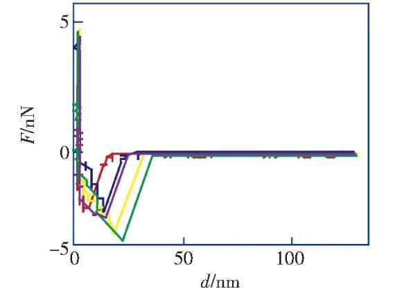 筆者利用原子力顯微鏡實驗測量了HOPG表面在醇-水替換前后的力距離曲線,發(fā)現(xiàn)醇-水替換前進(jìn)針曲線的跳進(jìn)距離小于5 nm,滿足DLVO理論;而在醇-水替換后納米氣泡覆蓋率為21.8%的情況下,進(jìn)針曲線的跳進(jìn)距離均大于10 nm,不能再用DLVO理論解釋,證明了IGE與納米氣泡共存這一現(xiàn)象。根據(jù)改進(jìn)的Laplace-Young方程,結(jié)合文獻(xiàn)中對納米氣泡線張力值的計算結(jié)果,分析負(fù)的線張力對過渡區(qū)內(nèi)局部表面張力及局部固-液界面的影響,導(dǎo)致納米氣泡的接觸角反常小的原因之一。分析并討論雜質(zhì)對納米氣泡接觸角的影響,指出IGE與納米氣泡共存、線張力及雜質(zhì)影響的共同作用是導(dǎo)致納米氣泡接觸角“反常小”的原因。