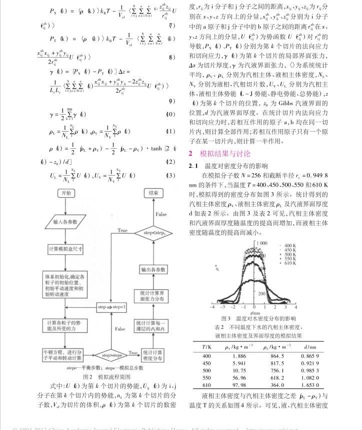 式中:U(k)為第k個切片的勢能,Uij(k)為i、j分子在第k個切片內(nèi)的勢能,nk為第k個切片的分子數(shù),Vs1為切片的體積,ρ(k)為第k個切片的數(shù)密度,rij為i分子和j分子之間的距離,xij、yij、zij為rij分別在x、y、z方向上的分量,、、分別為i分子中的a原子和j分子中的b原子之間的距離在x、y、z方向上的分量,U()為勢函數(shù)U()對的導(dǎo)數(shù),PN(k)、PT(k)分別為第k個切片的法向應(yīng)力和切向應(yīng)力,γ(k)為第k個切片的局部界面張力,Δz為切片厚度,γ為汽液界面張力,〈〉為系統(tǒng)統(tǒng)計平均,ρV、ρL分別為汽相主體、液相主體密度,NL、NV分別為液相、汽相切片數(shù),UV、UL分別為汽相主體、液相主體勢能(L-J勢能、靜電勢能、總勢能),z(k)為第k個切片的位置,z0為Gibbs汽液界面的位置,d為汽液界面厚度。在統(tǒng)計切片內(nèi)法向應(yīng)力和切向應(yīng)力時,若相互作用的原子a,b均在同一切片內(nèi),則計算全部作用;若相互作用原子只有一個原子在某一切片內(nèi),則計算一半作用。