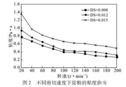 粘度是反映液體流變性能最常用的指標,粘度越小其流變性越高。由圖2可知,在同一轉速下,隨著取代度的增加,棕櫚酸酯淀粉糊液粘度升高;隨轉速增大,粘度先急劇下降后逐漸趨向平緩。棕櫚酸酯淀粉糊液粘度隨剪切速率的增大而減小,呈現“剪切稀化”特性,屬假塑性流體。淀粉糊液“剪切稀化”的程度與分子鏈的長短有關,高DS淀粉酯相對分子質量較高,“剪切稀化”程度也較大。淀粉糊液表觀粘度隨著剪切速率的增大而降低,表明淀粉凝膠網絡體系中分子間或分子內的作用力(氫鍵)在較高的剪切速率下更容易被破壞。當剪切速率繼續增加到淀粉分子纏結點、范德華力作用點被破壞完全來不及重建時,淀粉糊液表觀粘度趨于最小值。
