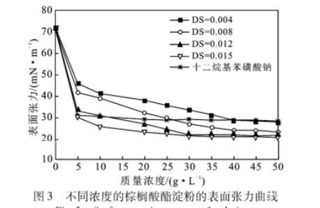 不同DS不同質量濃度的棕櫚酸酯淀粉具有不同的表面張力,DS越高、質量濃度越大,其表面張力越低,DS越高的淀粉其表面張力趨于穩定的濃度越低,即臨界膠束濃度(cmc)越低。臨界膠束濃度(cmc)是表面活性劑的重要特征參數,cmc越低的表面活性劑的效率越高。實驗范圍內的棕櫚酸酯淀粉具有較高的表面活性,可作為表面活性劑應用。