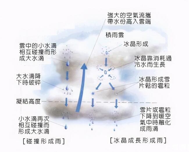 3.當小水滴數量足夠多的時候就聚積組成了云,小水滴在云里來回地相互碰撞,有些小水滴會溶合成體積更大的大水滴,然而大體積的水滴此時的質量是大于空氣質量的,此時空氣是沒有力量能夠把水滴停留在大氣中,因此水滴會在萬有引力的作用下掙脫云的束縛從天而降,降下來的水就是「雨」了。