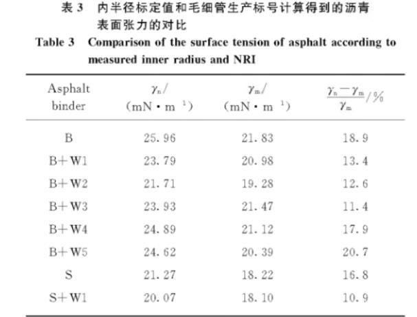 表3內(nèi)半徑標定值和毛細管生產(chǎn)標號計算得到的瀝青表面張力的對比