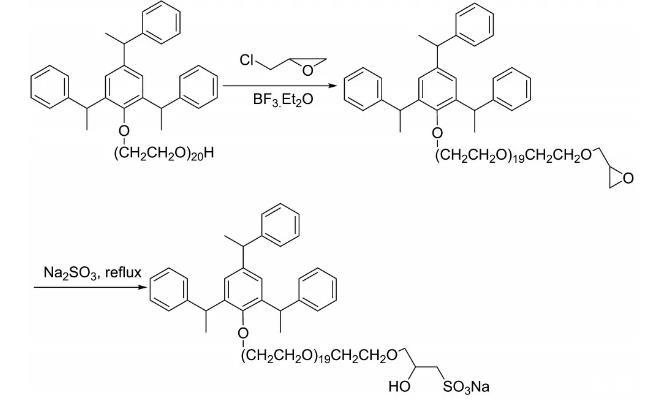 采用“一鍋煮”法制備表面活性劑,合成路線如圖1所示。將一個(gè)帶有機(jī)械攪拌器,回流冷凝管和恒壓滴液漏斗的500 mL三頸瓶置于80℃的恒溫水浴中,先后加入92 g的三苯乙烯苯酚聚氧乙烯醚-25和75 mL的正庚烷,向攪拌后形成的溶液中加入2 mL的三氟化硼乙醚催化劑,用恒壓滴液漏斗滴加過量的環(huán)氧氯丙烷溶液,滴加完后升溫至90℃反應(yīng)3 h;然后滴加20%NaOH水溶液,維持反應(yīng)體系的pH值在7.5~9,TLC監(jiān)測反應(yīng)進(jìn)程到原料點(diǎn)消失后結(jié)束反應(yīng)。向產(chǎn)物中加入二甲亞砜,溶解后過濾除去反應(yīng)中生成的鹽;用正庚烷萃取、水洗后旋轉(zhuǎn)蒸發(fā)除去溶劑;將粗產(chǎn)物溶解于乙醇中,向其中滴加100 mL的25%的亞硫酸鈉溶液,分批加入6 mol/L的鹽酸溶液維持反應(yīng)體系的pH值在7~9,在80℃的恒溫水浴中繼續(xù)反應(yīng)過夜,將反應(yīng)物用熱的異丙醇萃取后過濾除去無機(jī)鹽,將濾液旋轉(zhuǎn)蒸發(fā)除去溶劑得到黃色產(chǎn)物三苯乙烯基聚氧乙烯醚羥丙基磺酸鈉,即為表面活性劑TPHS。
