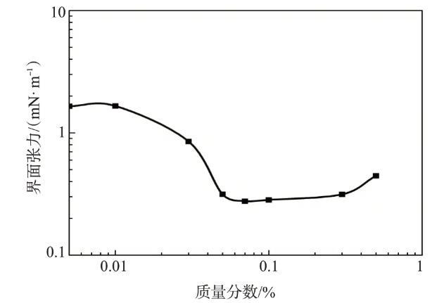 根據(jù)吉布斯吸附理論,為了達(dá)到超低油/水界面張力,表面活性劑分別與油相和水相發(fā)生強的相互作用并且在油水界面達(dá)到飽和吸附。這要求表面活性劑同時具有大的親水基和疏水基。不同濃度的表面活性劑TPHS溶液與大慶原油間的界面張力如圖3所示,隨著表面活性劑TPHS質(zhì)量分?jǐn)?shù)的增大,界面張力先減小后緩慢增大,在較大的濃度范圍內(nèi)可保持在10-1mN/m數(shù)量級。TPHS質(zhì)量分?jǐn)?shù)為0.07%時,界面張力達(dá)到最低,為0.276 mN/m。TPHS具有較好的降低油水界面張力的能力。